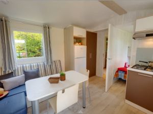 - La 2ème chambre est équipée de 2 lits 80 cm X 190 cm et d’un troisième lit superposé rabattable 70cm X 190cm.