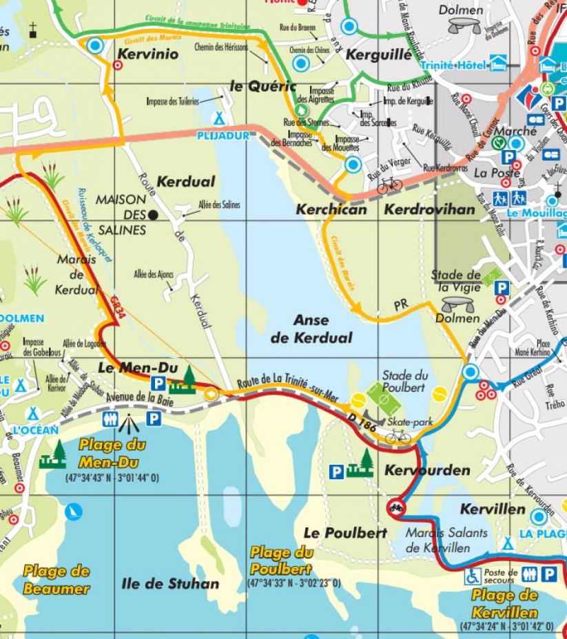 En prolongeant le sentier des douaniers, ce circuit fait la jonction entre La Trinité sur Mer et Carnac. Il longe les plages du Poulbert et du Men-dû puis traverse le marais de Kerdual. C'est une très belle balade accessible à tous, avec la découverte de milieux naturels protégés mais aussi du patrimoine bâti de notre région : villages traditionnels, lavoirs et fontaines, salines et greniers à sel...